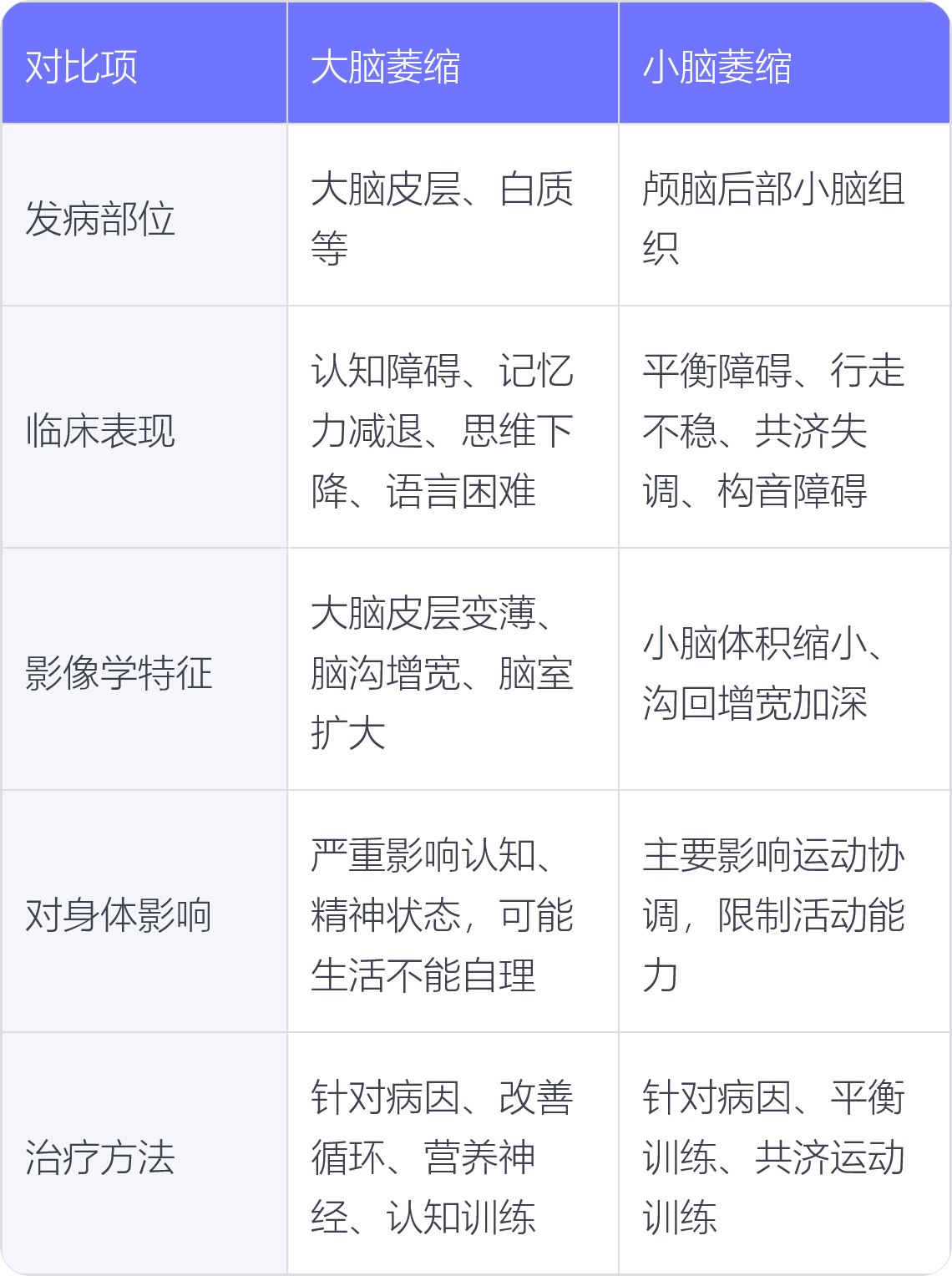 5. 治疗方法:大脑萎缩治疗多针对病因,如改善脑血管循环、营养神经等,同时进行认知康复训练;小脑萎缩治疗也是针对病因,配合平衡训练、共济运动训练等康复治疗。
