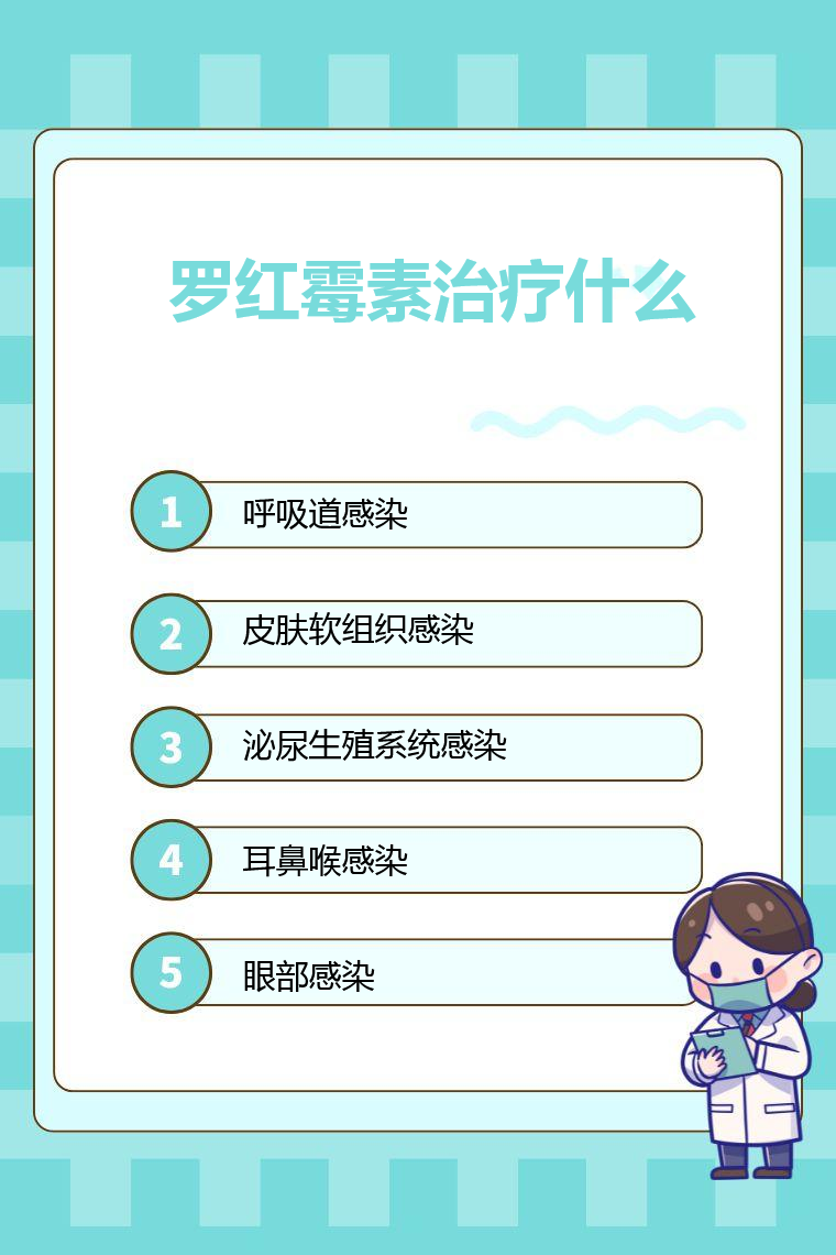 罗红霉素可治疗呼吸道感染、皮肤软组织感染、泌尿生殖系统感染、耳鼻喉感染、眼部感染等。