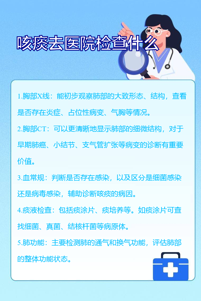 咳痰去医院通常需检查胸部X线、胸部CT、血常规、痰液检查、肺功能等。