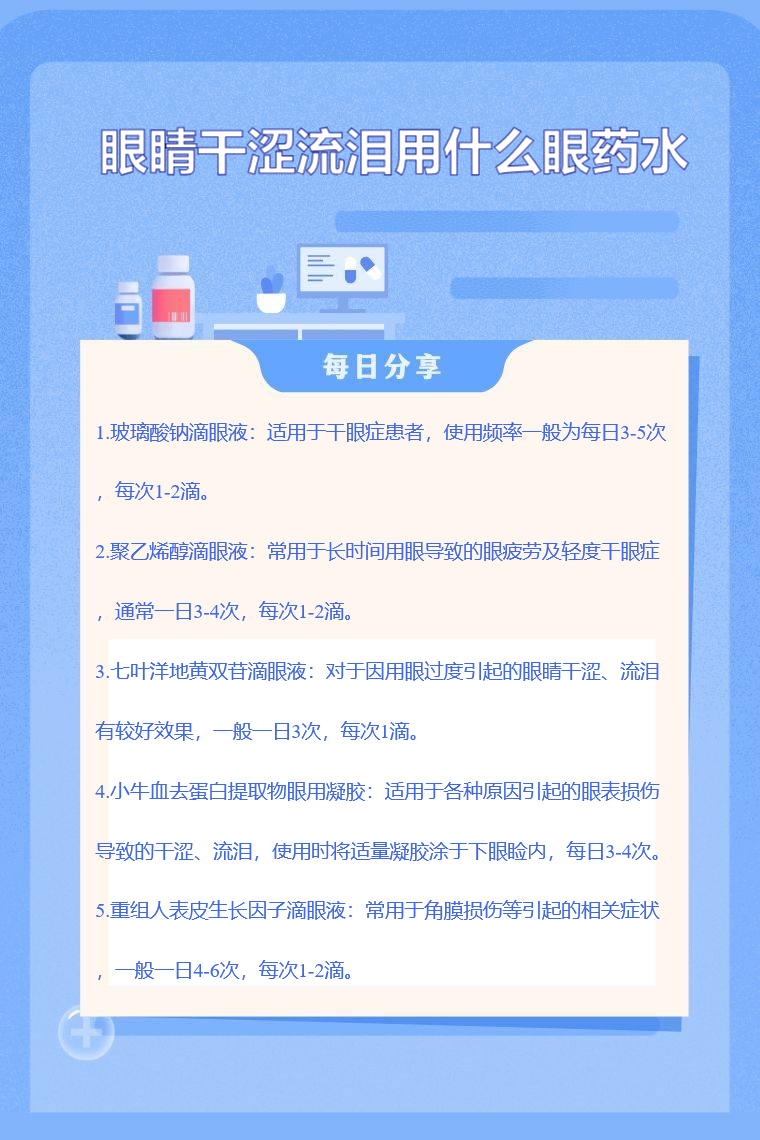 1.玻璃酸钠滴眼液:为人工泪液,能模拟人体自身泪液成分,增加眼表湿度,改善泪膜稳定性,缓解因泪液分泌不足或蒸发过快导致的眼睛干涩、流泪症状,适用于干眼症患者,使用频率一般为每日3-5次,每次1-2滴。