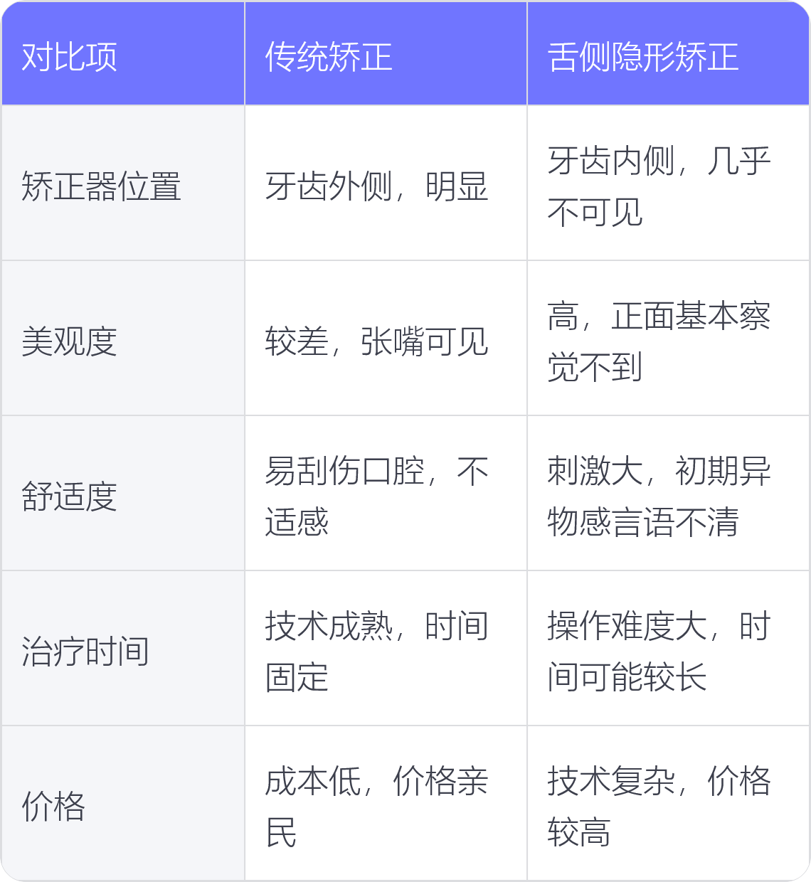 传统矫正与舌侧隐形矫正在矫正器位置、美观度、舒适度、治疗时间、价格方面存在不同。