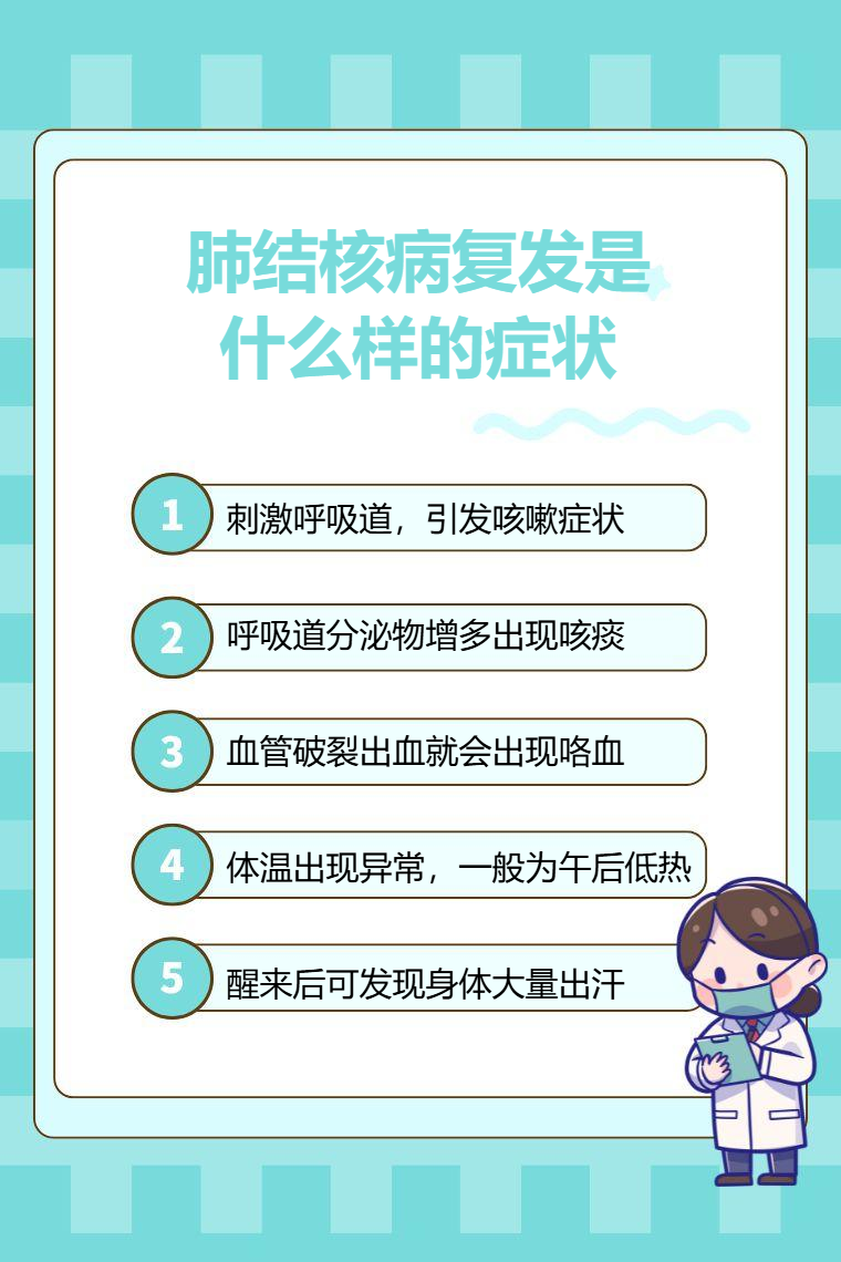 肺结核病复发的症状有咳嗽、咳痰、咯血、低热、盗汗等。