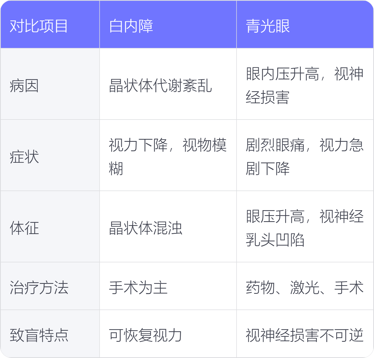 5. 致盲特点:白内障若不及时治疗,最终可导致完全失明,但通过手术大多可恢复视力;青光眼造成的视神经损害不可逆,一旦失明难以恢复。