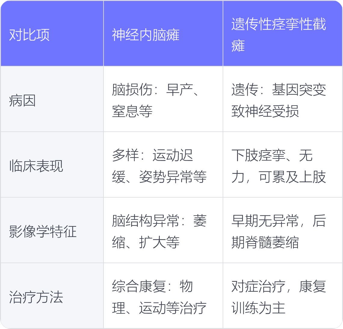 神经内脑瘫与遗传性痉挛性截瘫在病因、临床表现、影像学特征、治疗方法上存在不同。