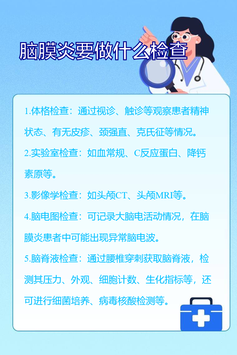 脑膜炎的检查项目有体格检查、实验室检查、影像学检查、脑电图检查、脑脊液检查等。