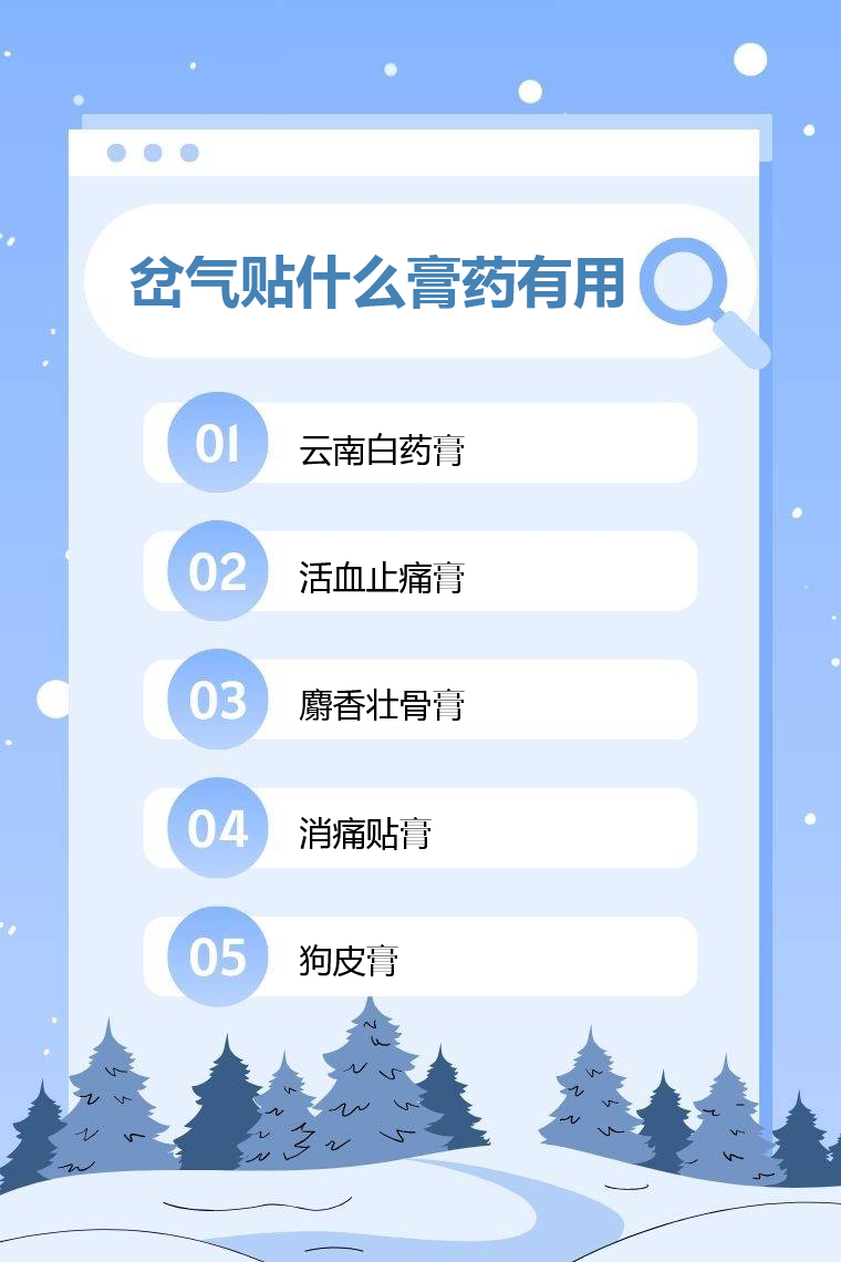 岔气可使用云南白药膏、活血止痛膏、麝香壮骨膏、消痛贴膏、狗皮膏等。