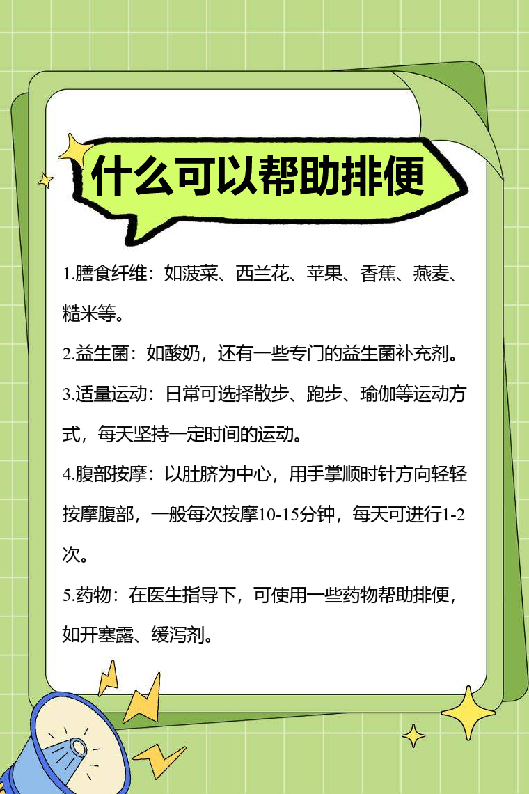 膳食纤维、益生菌、适量运动、腹部按摩、药物等可以帮助排便。