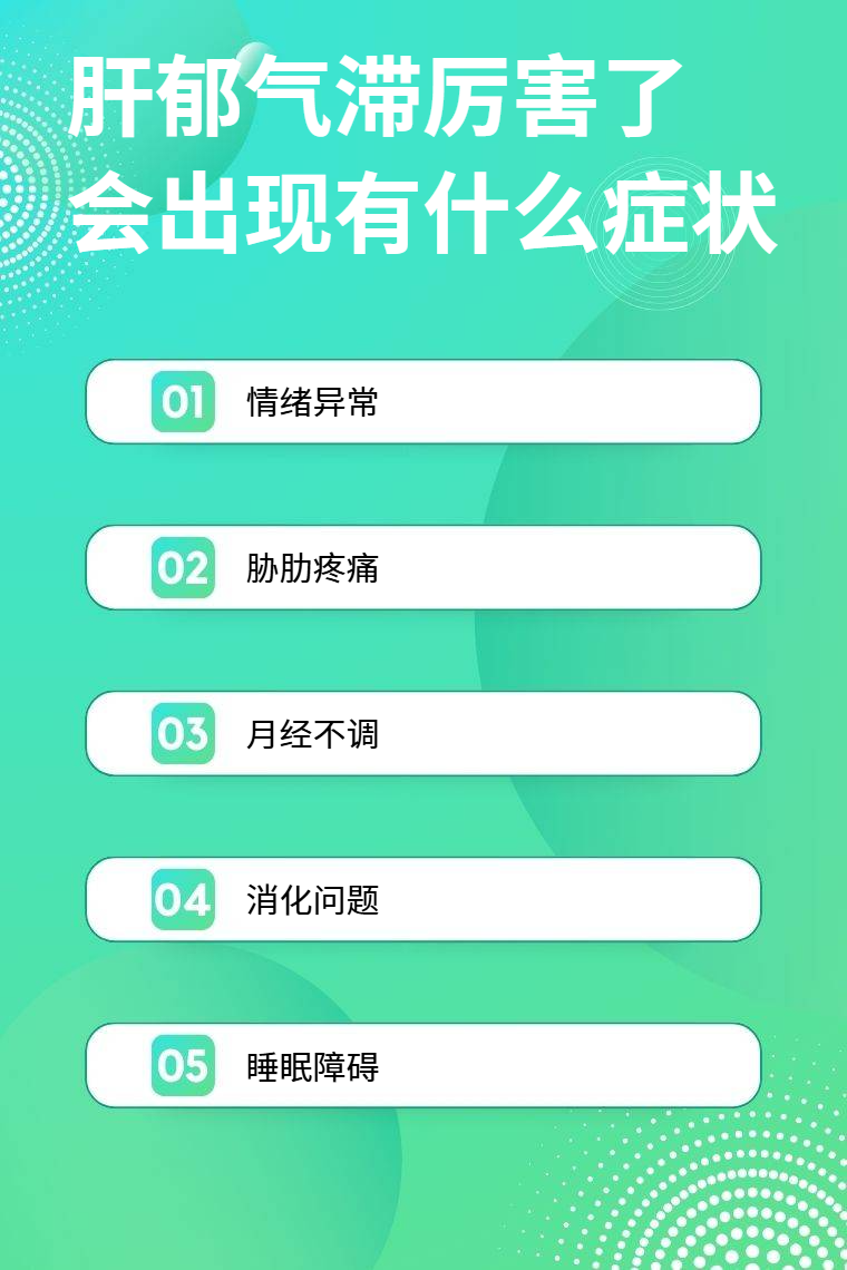 肝郁气滞严重时会出现情绪异常、胁肋疼痛、月经不调、消化问题、睡眠障碍等。