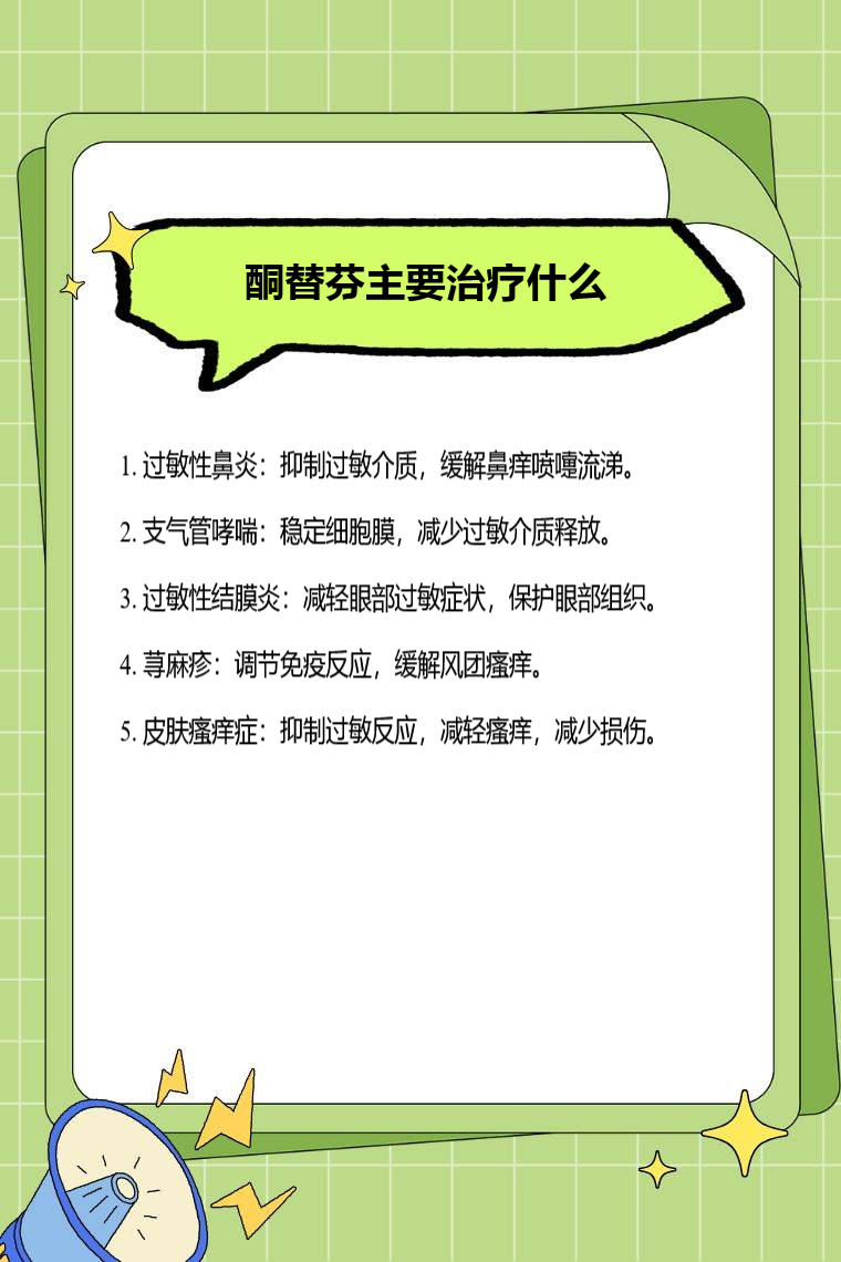 酮替芬主要治疗过敏性鼻炎、支气管哮喘、过敏性结膜炎、荨麻疹、皮肤瘙痒症等。