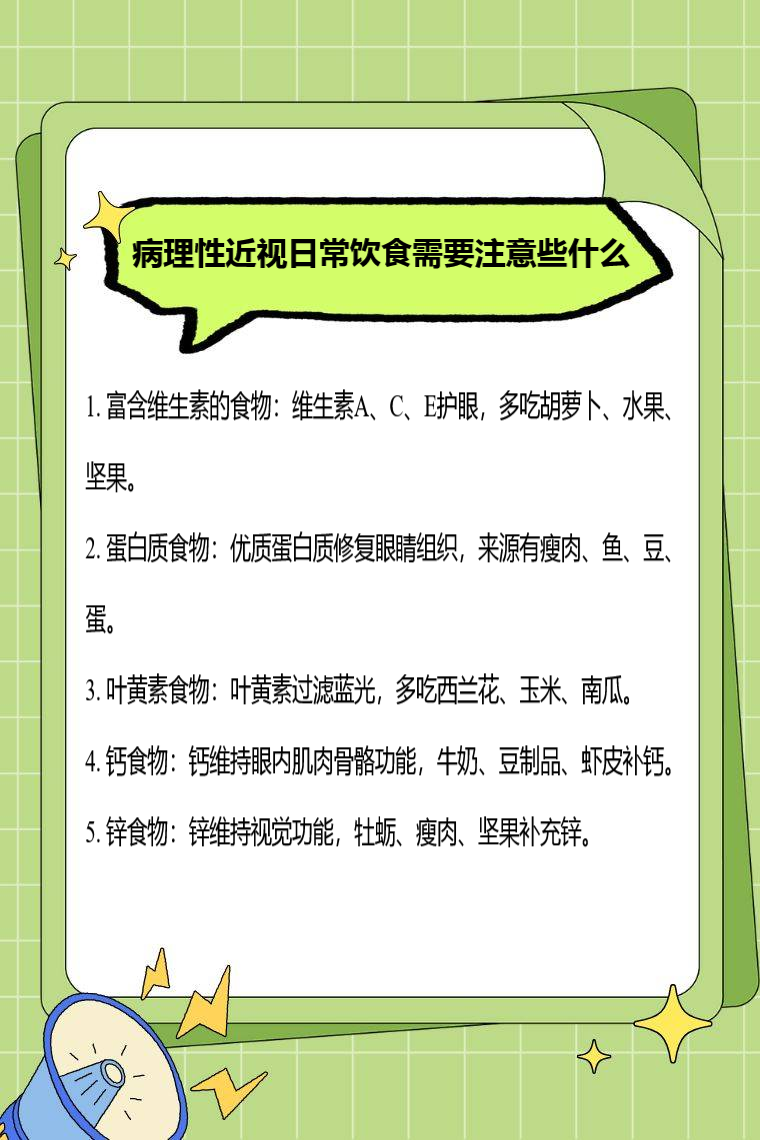 病理性近视日常饮食需注意富含维生素、蛋白质、叶黄素、钙、锌等食物的摄入等。