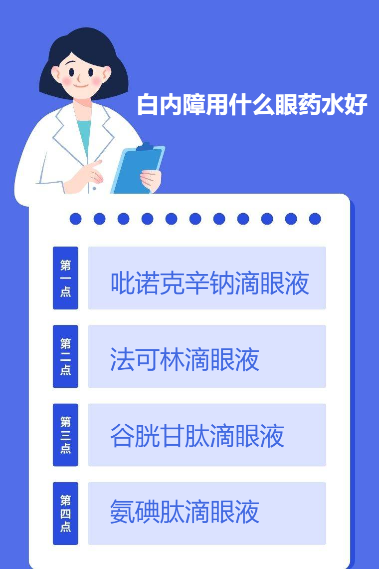 治疗白内障的眼药水有吡诺克辛钠滴眼液、法可林滴眼液、谷胱甘肽滴眼液、氨碘肽滴眼液等。