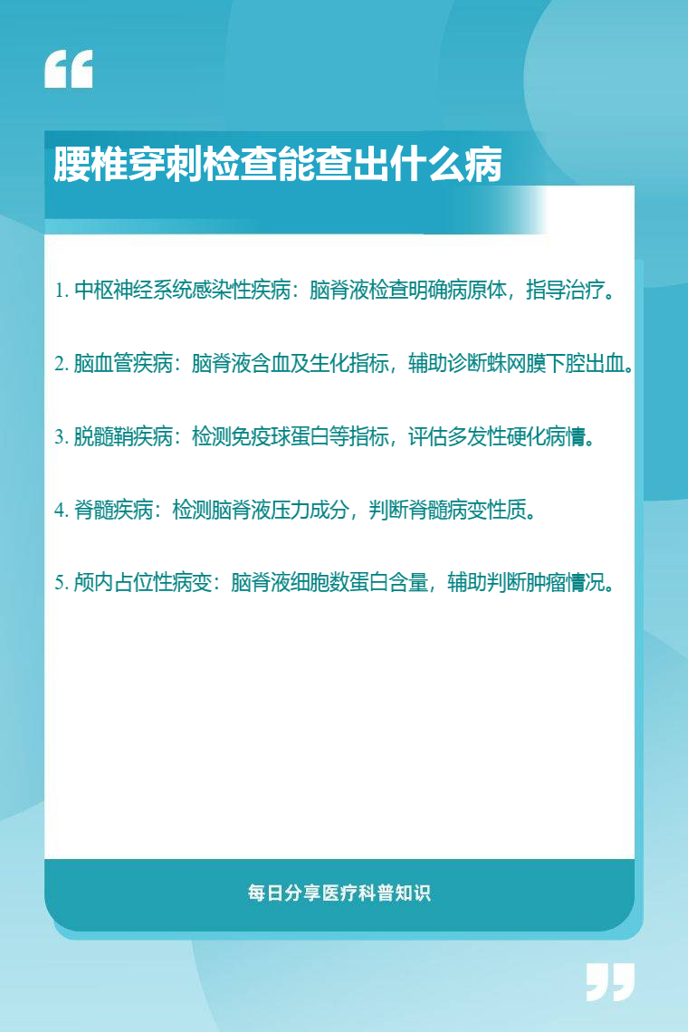 腰椎穿刺检查能查出中枢神经系统感染性疾病、脑血管疾病、脱髓鞘疾病、脊髓疾病、颅内占位性病变等。