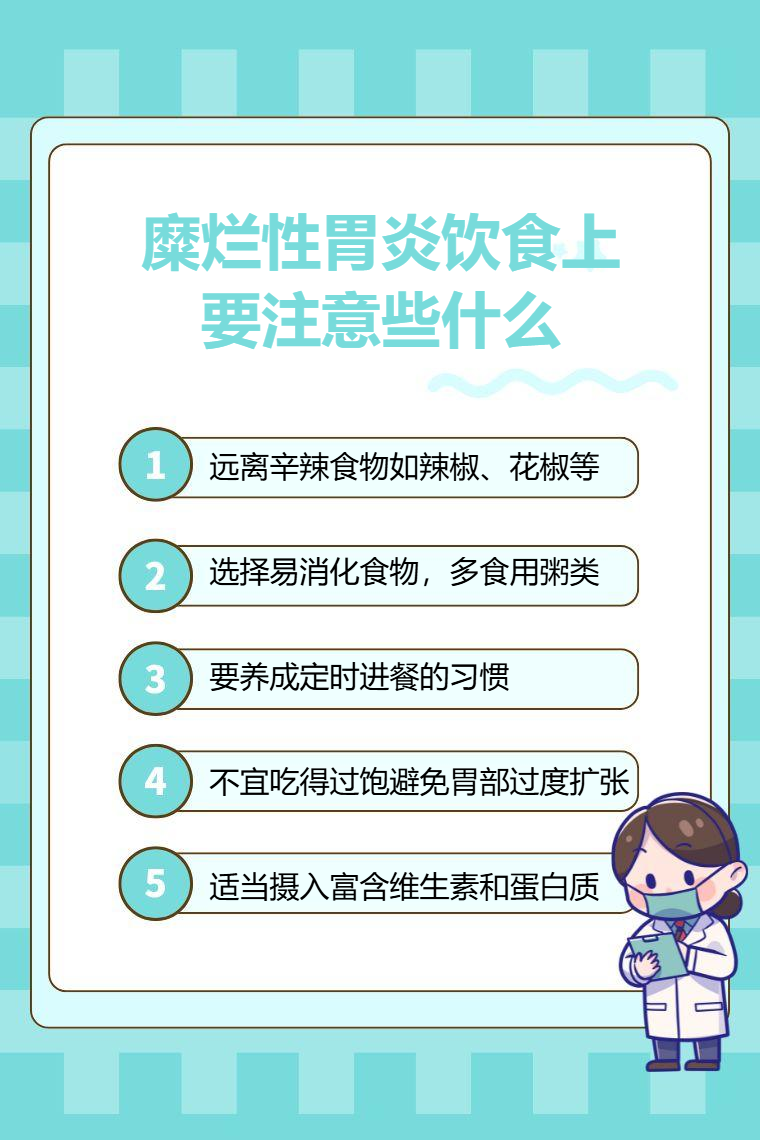 糜烂性胃炎饮食上要注意避免刺激性食物、选择易消化食物、规律进食、控制食量、补充营养等。
