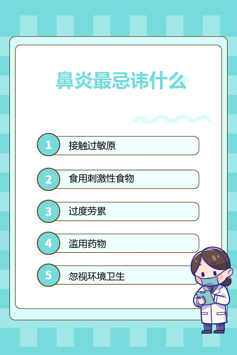 鼻炎最忌讳接触过敏原、食用刺激性食物、过度劳累、滥用药物、忽视环境卫生等。