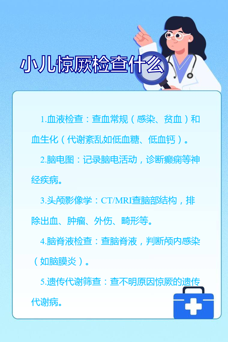 小儿惊厥检查项目包括血液检查、脑电图、头颅影像学检查、脑脊液检查、遗传代谢筛查等。