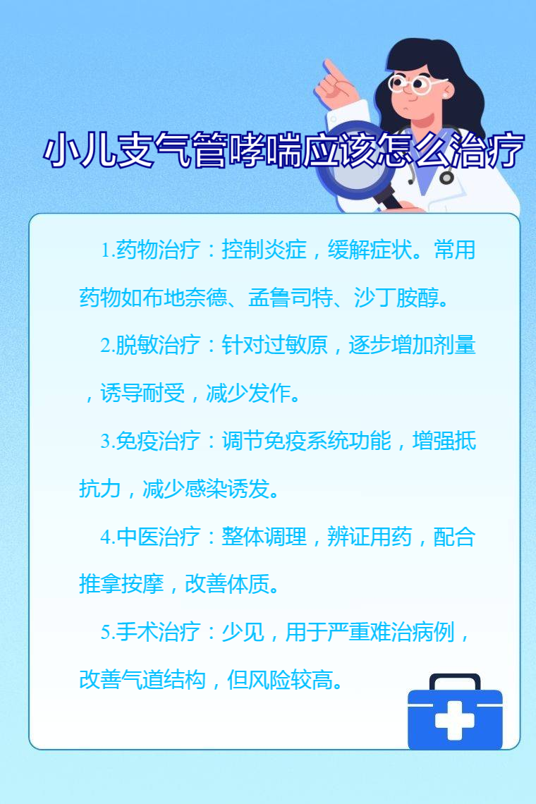 小儿支气管哮喘的治疗方法主要有药物治疗、脱敏治疗、免疫治疗、中医治疗、手术治疗等。