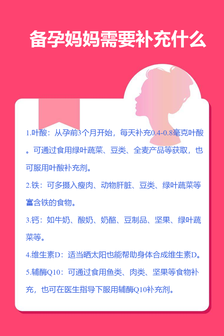 备孕妈妈需要补充叶酸、铁、钙、维生素D、辅酶Q10等。