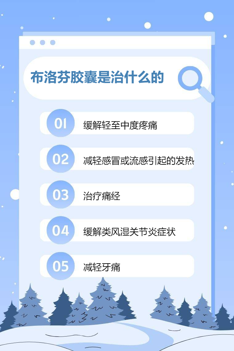 布洛芬胶囊可用于缓解轻至中度疼痛、减轻感冒或流感引起的发热、治疗痛经、缓解类风湿关节炎症状、减轻牙痛等。
