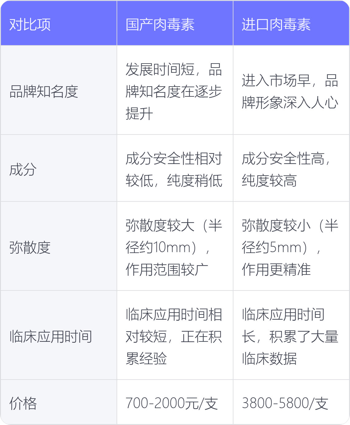 2. 成分:进口肉毒素在成分研发和配比上有较长时间的积累和优化;国产肉毒素在成分上也在不断追赶,努力达到高质量标准,但在一些细微成分差异上与进口产品有别。
