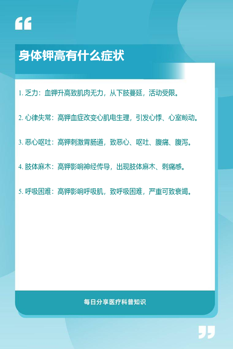 身体钾高的症状有乏力、心律失常、恶心呕吐、肢体麻木、呼吸困难等。