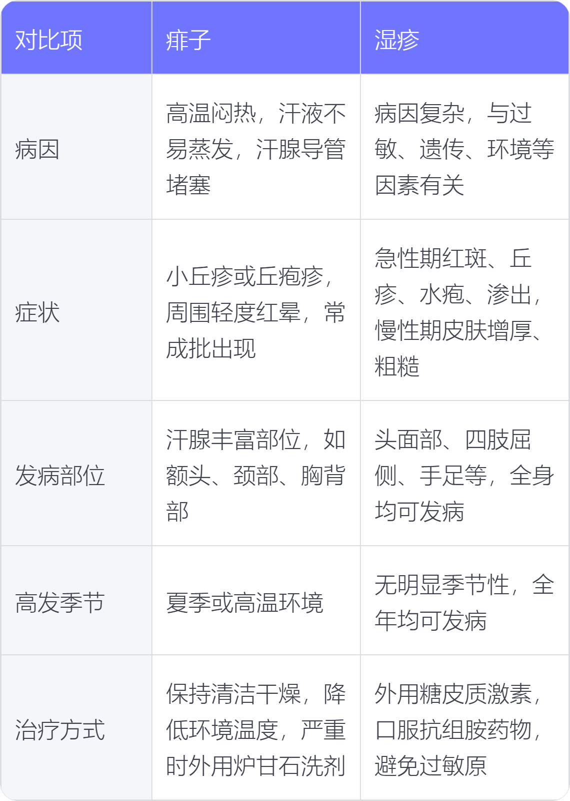 4. 高发季节:痱子常在夏季或高温环境中容易出现;湿疹没有明显的季节性,全年均可发病,但在某些特定环境或诱发因素下更易发作。