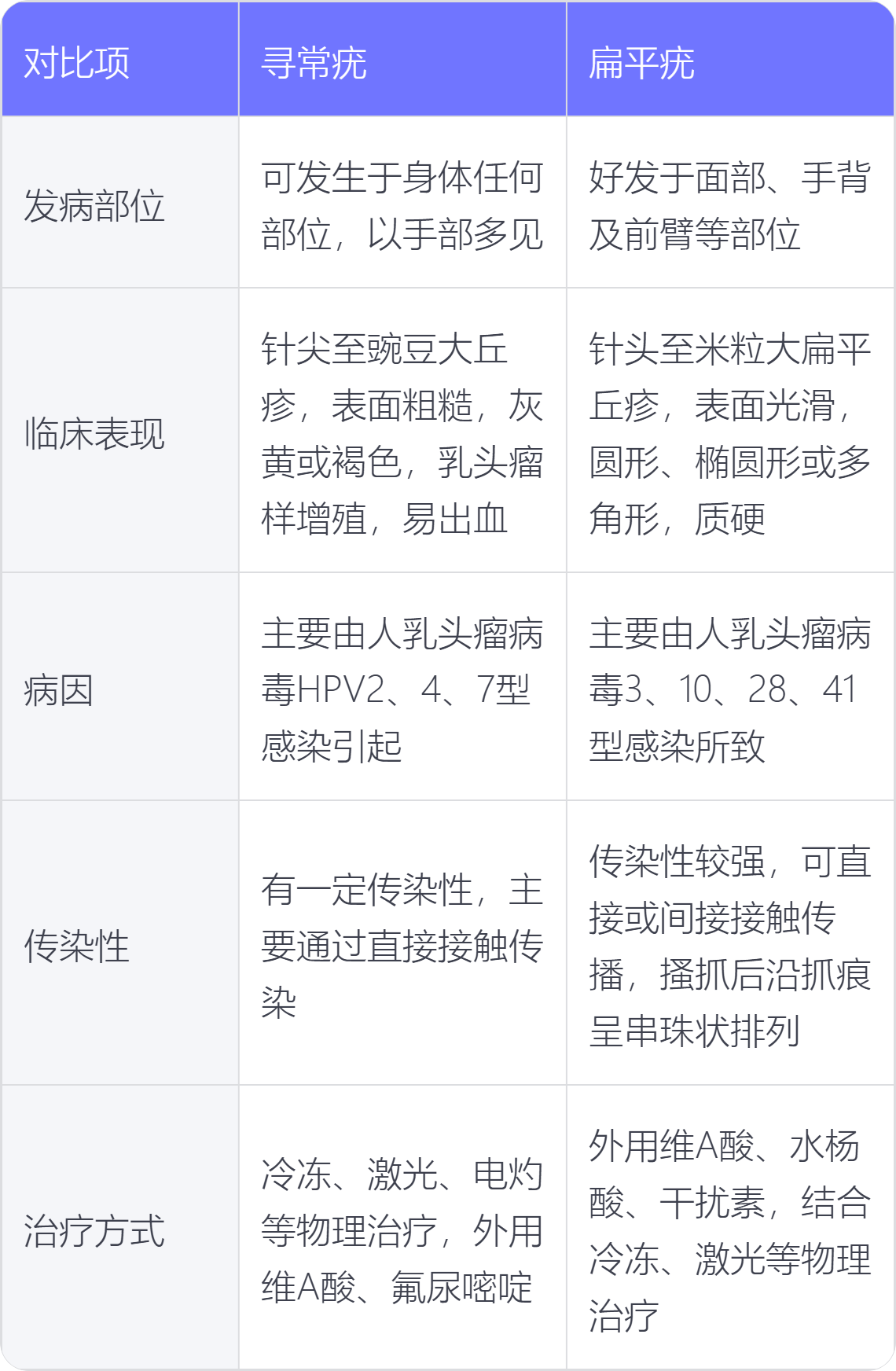 寻常疣和扁平疣在发病部位、临床表现、病因、传染性、治疗方式等方面上存在不同。