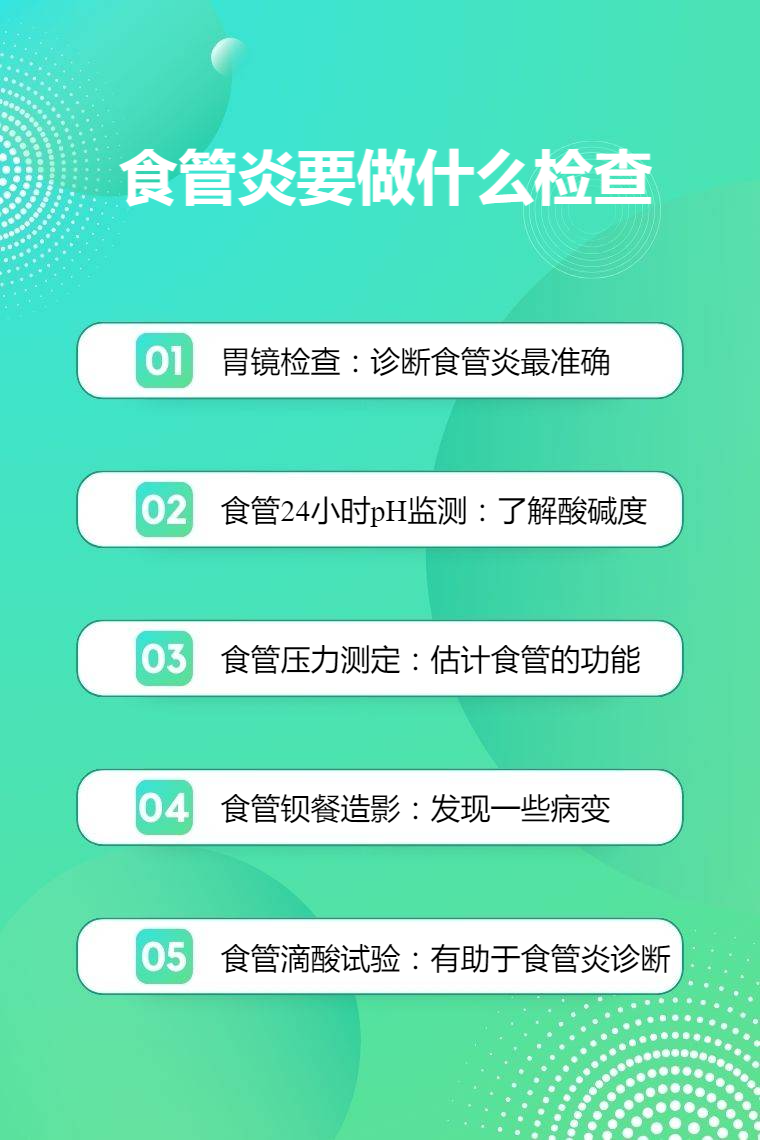 食管炎的检查项目有胃镜检查、食管 24 小时 pH 监测、食管压力测定、食管钡餐造影、食管滴酸试验等。