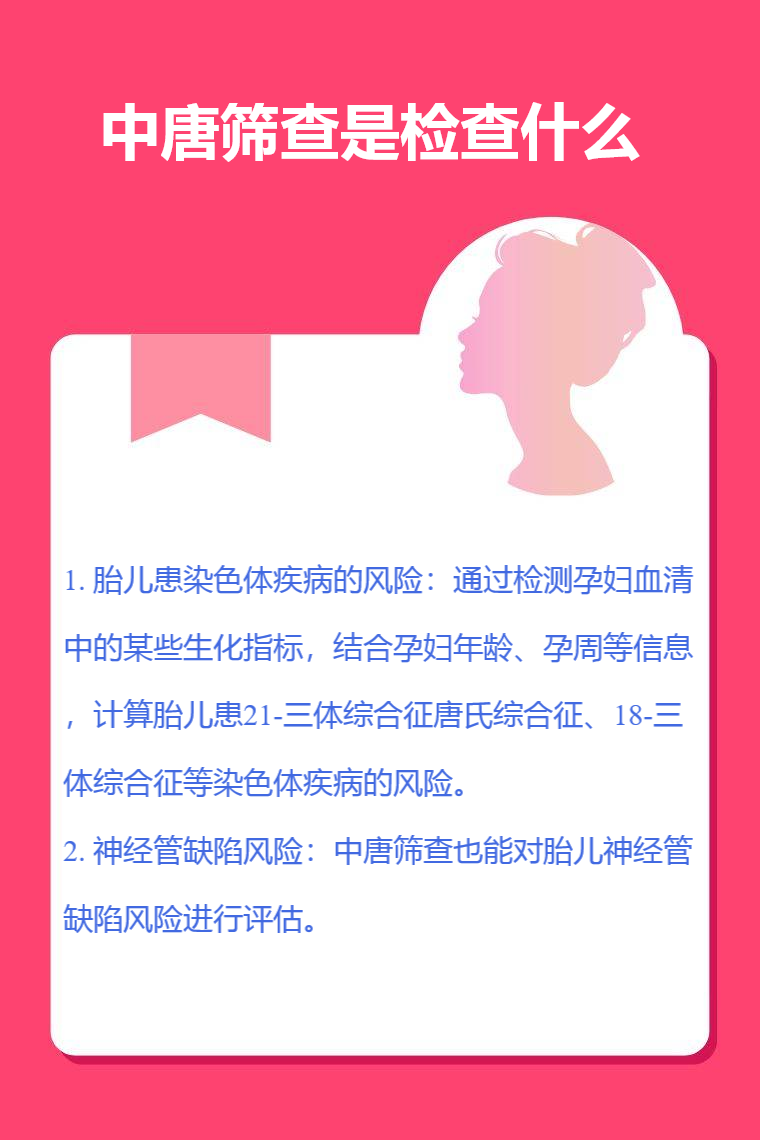 中唐筛查主要检查胎儿患染色体疾病的风险、神经管缺陷风险等。