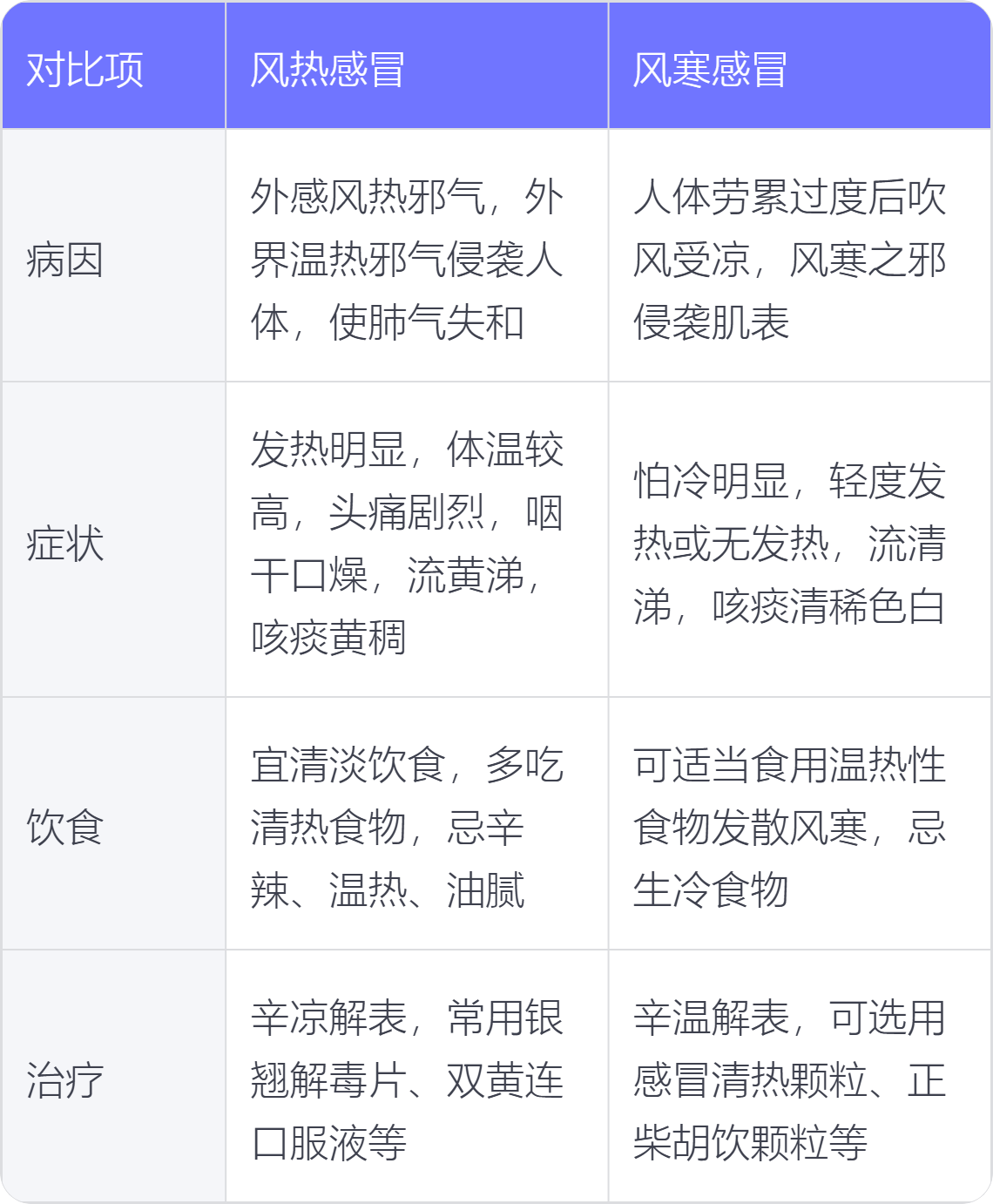 2. 症状:风热感冒发热明显,体温可较高,伴有剧烈头痛、咽干口燥、流黄涕、舌苔薄黄、咳痰黄色黏稠等;风寒感冒主要症状为怕冷明显,轻度发热或无发热,流清涕,咳痰清稀色白,舌苔薄白而润。