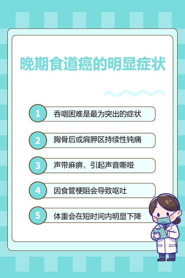 晚期食道癌的明显症状有吞咽困难、疼痛、声音嘶哑、呕吐、体重下降等。