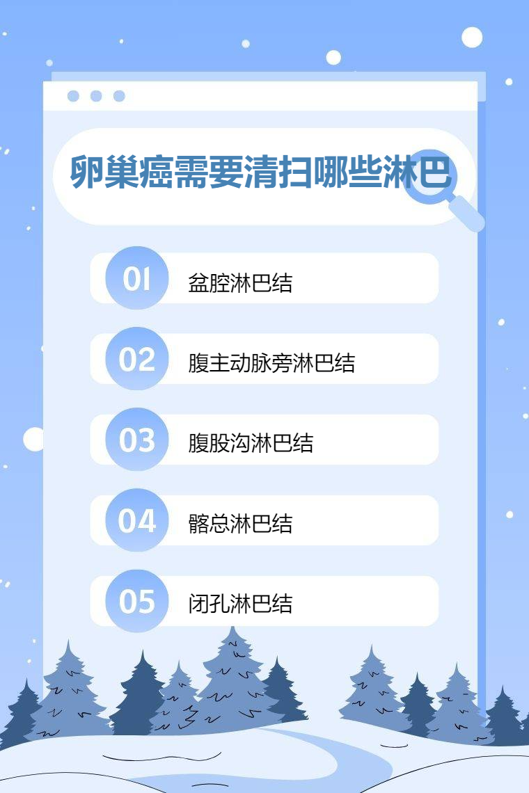 卵巢癌需要清扫的淋巴包括盆腔淋巴结、腹主动脉旁淋巴结、腹股沟淋巴结、髂总淋巴结、闭孔淋巴结等。