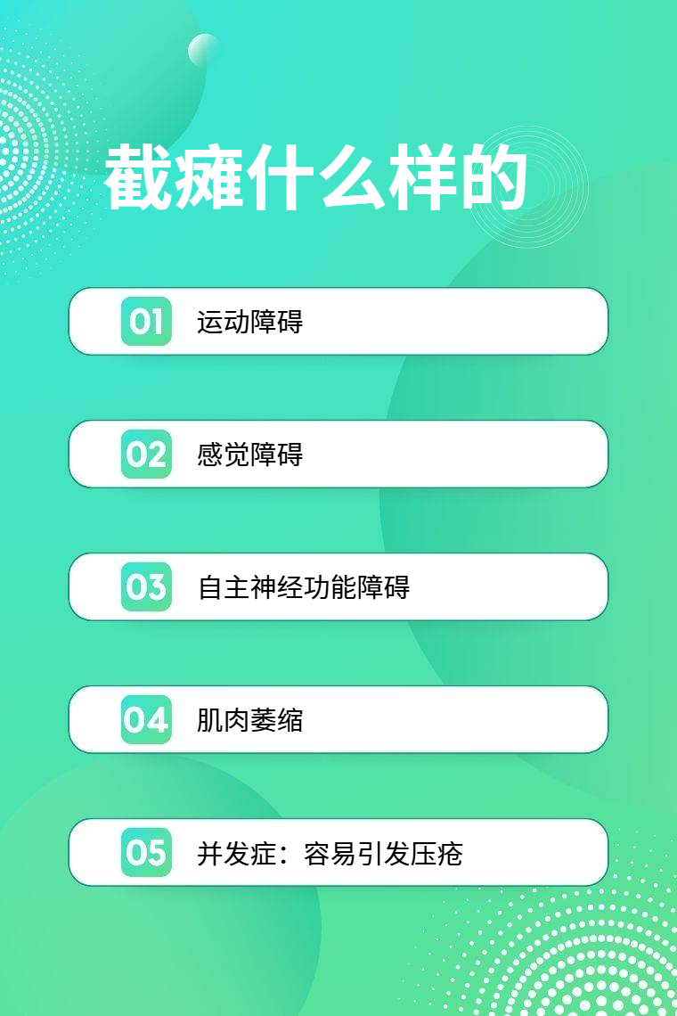 1. 运动障碍:截瘫患者的肢体运动功能受限,从下肢无力、活动不灵活到完全无法自主运动,程度不一。受损平面以下的肢体无法正常完成行走、站立、抓握等动作,严重影响日常活动能力。