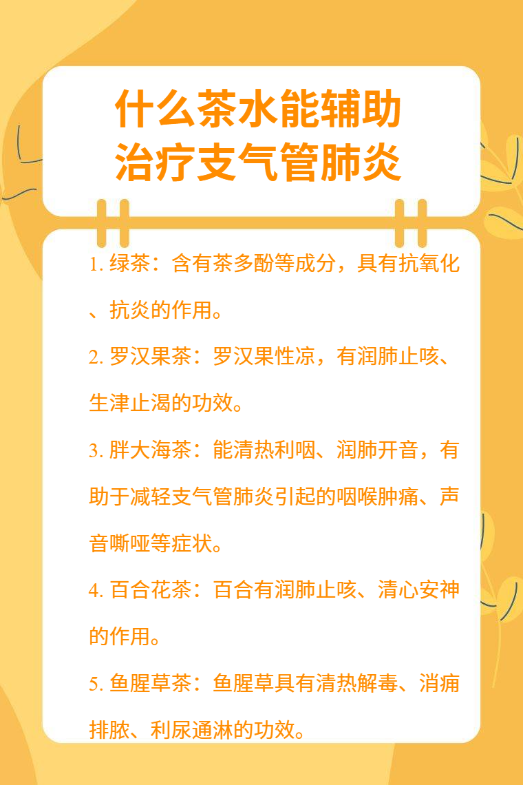 绿茶、罗汉果茶、胖大海茶、百合花茶、鱼腥草茶等茶水能辅助治疗支气管肺炎。