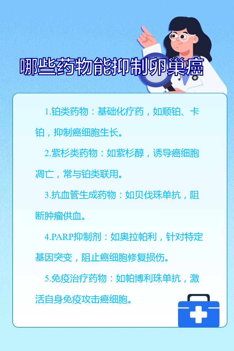 能抑制卵巢癌的药物有铂类药物、紫杉类药物、抗血管生成药物、PARP抑制剂、免疫治疗药物等。