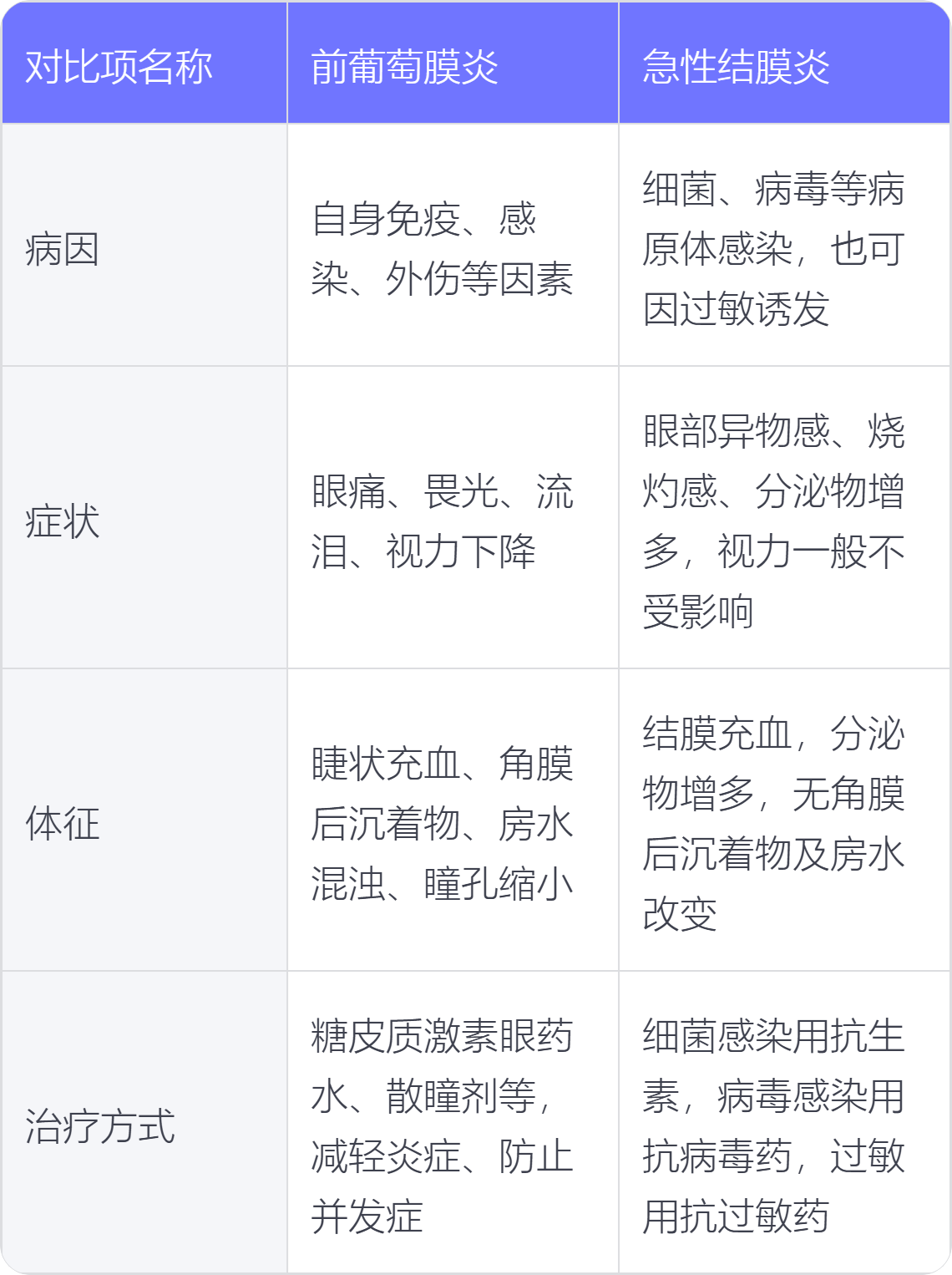 前葡萄膜炎与急性结膜炎在病因、症状、体征、治疗方式上存在不同。