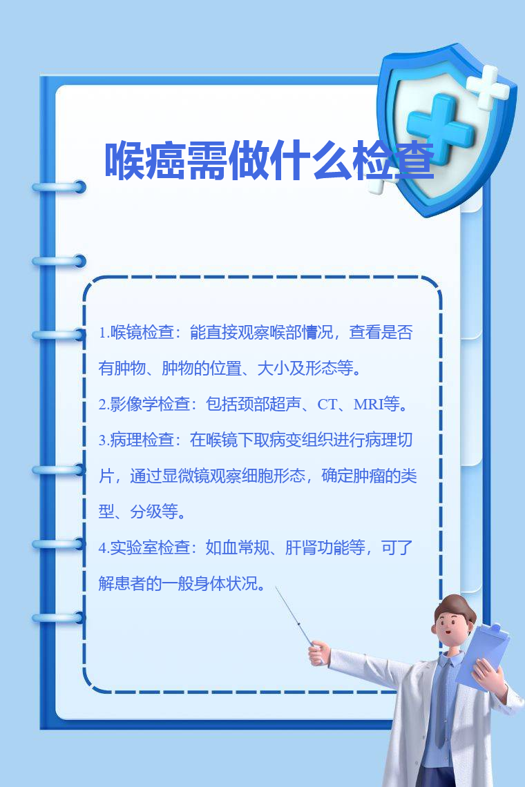 喉癌需做喉镜检查、影像学检查、病理检查、实验室检查等。