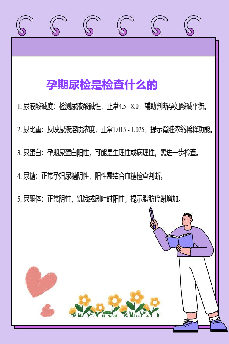 孕期尿检主要检查尿液酸碱度、尿比重、尿蛋白、尿糖、尿酮体等。
