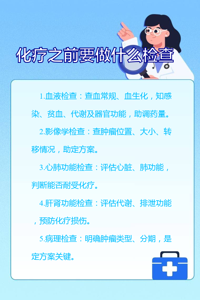 化疗之前要做血液检查、影像学检查、心肺功能检查、肝肾功能检查、病理检查等。