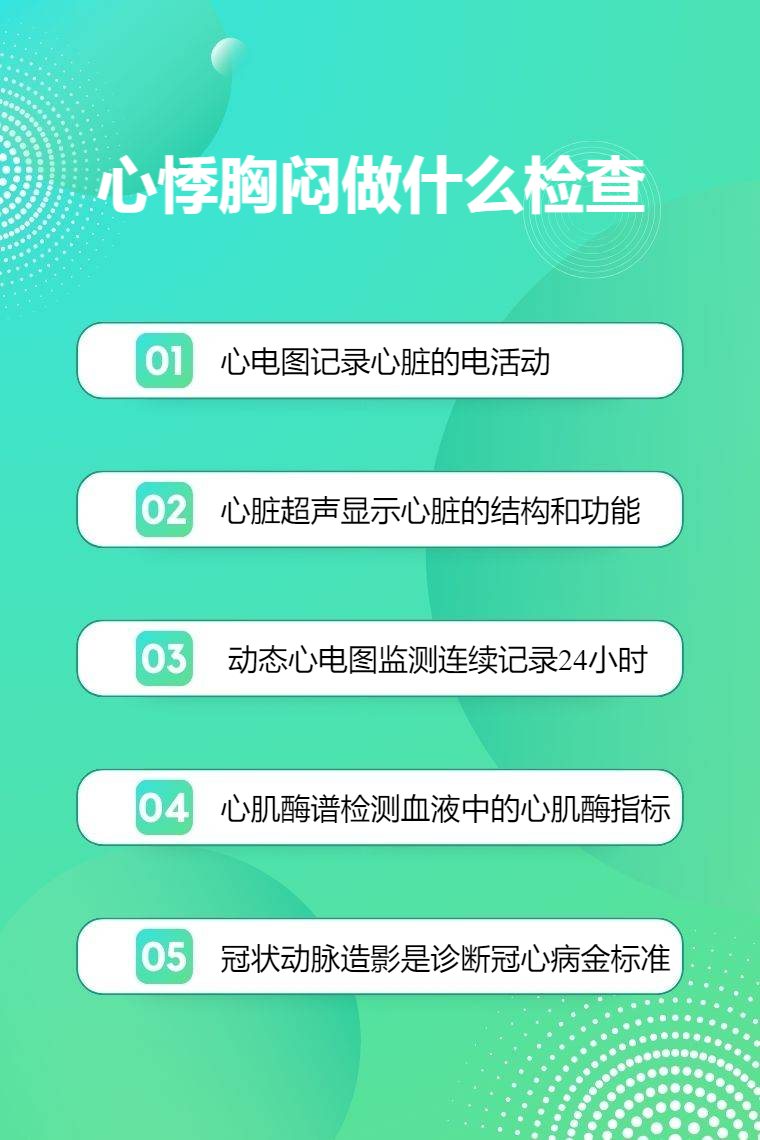 心悸胸闷可做心电图、心脏超声、动态心电图监测、心肌酶谱、冠状动脉造影等检查。