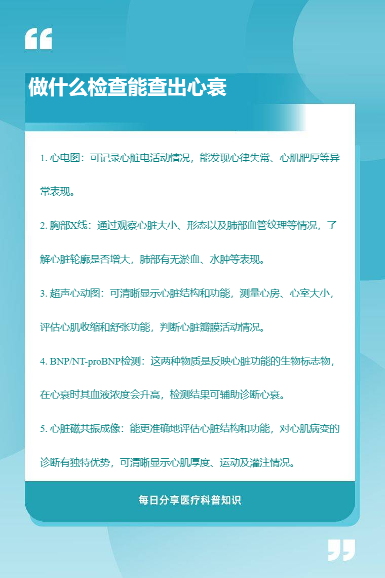 能查出心衰的检查有心电图、胸部X线、超声心动图、BNP/NT-proBNP检测、心脏磁共振成像等。