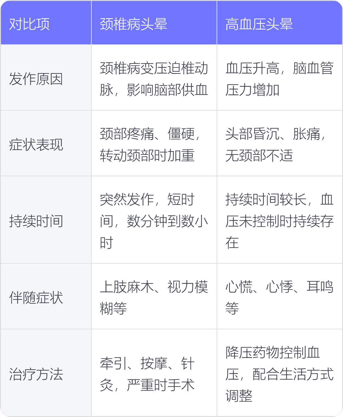 5. 治疗方法:颈椎病头晕治疗多通过牵引、按摩、针灸等物理治疗,严重时需手术;高血压头晕主要依靠降压药物控制血压,配合生活方式调整。