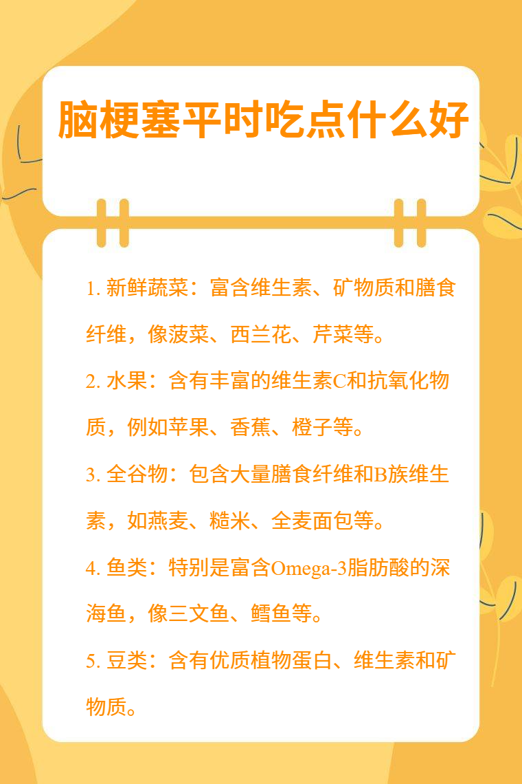 脑梗塞患者平时适宜食用新鲜蔬菜、水果、全谷物、鱼类、豆类等。