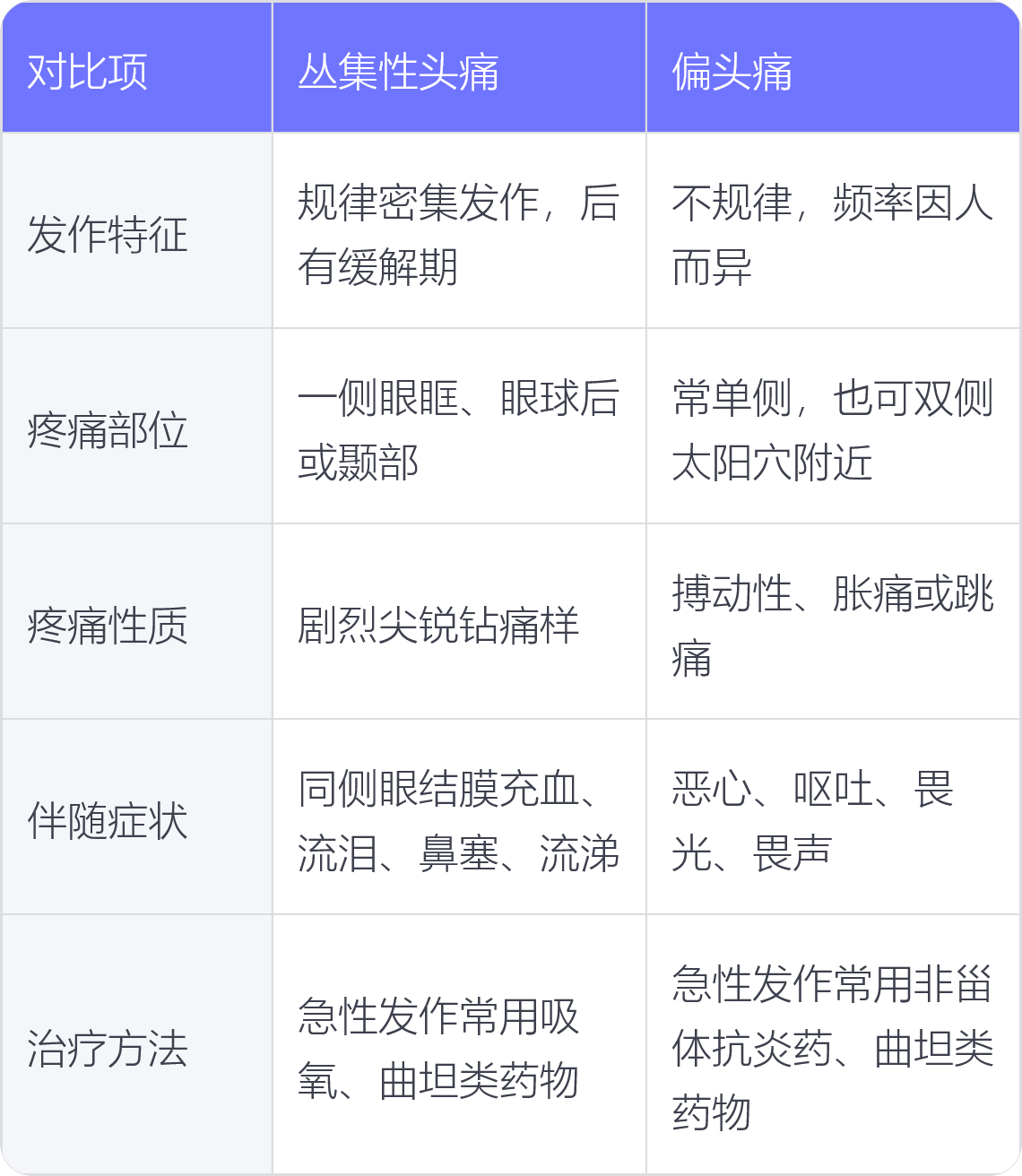 丛集性头痛与偏头痛在发作特征、疼痛部位、疼痛性质、伴随症状、治疗方法上存在不同。