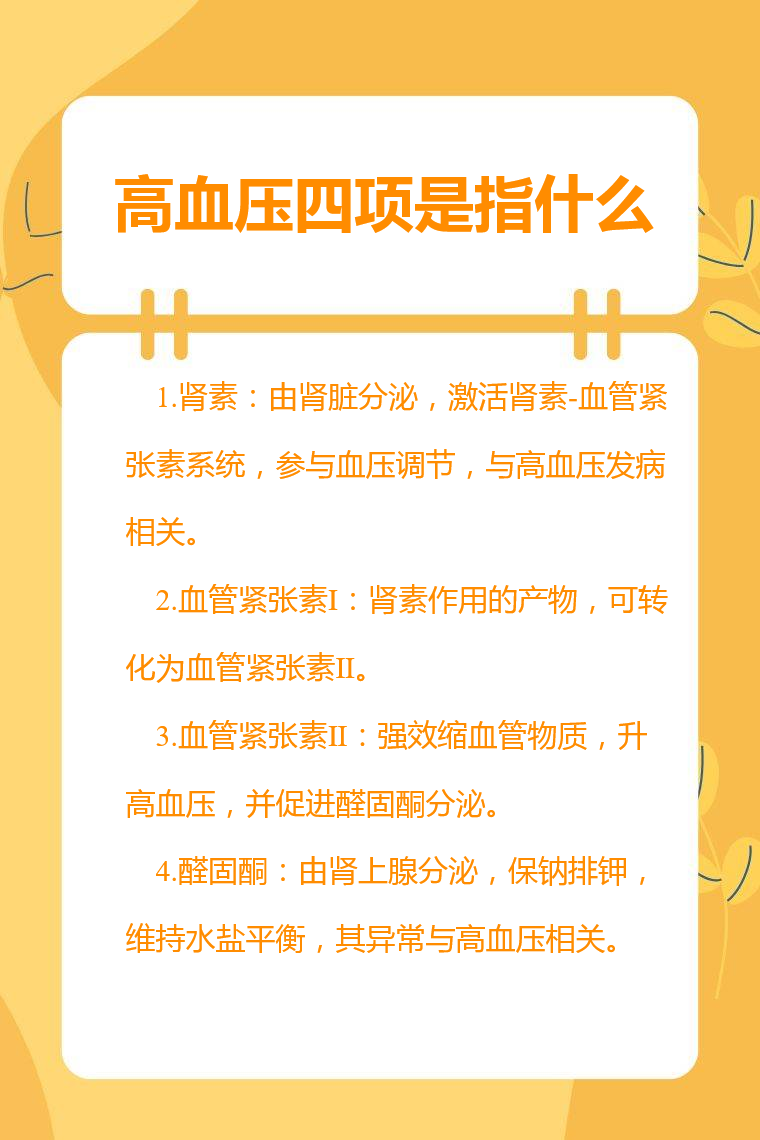 高血压四项是指肾素、血管紧张素 Ⅰ、血管紧张素 Ⅱ、醛固酮等。