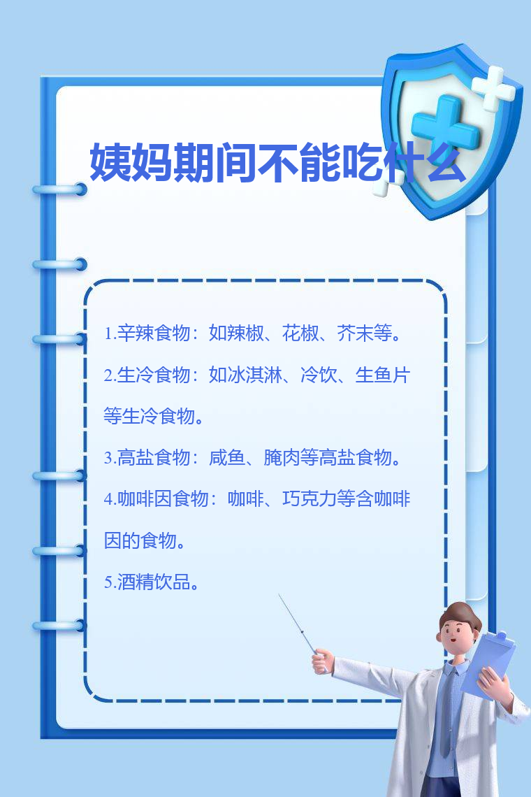 姨妈期间不能吃辛辣食物、生冷食物、高盐食物、咖啡因食物、酒精饮品等。