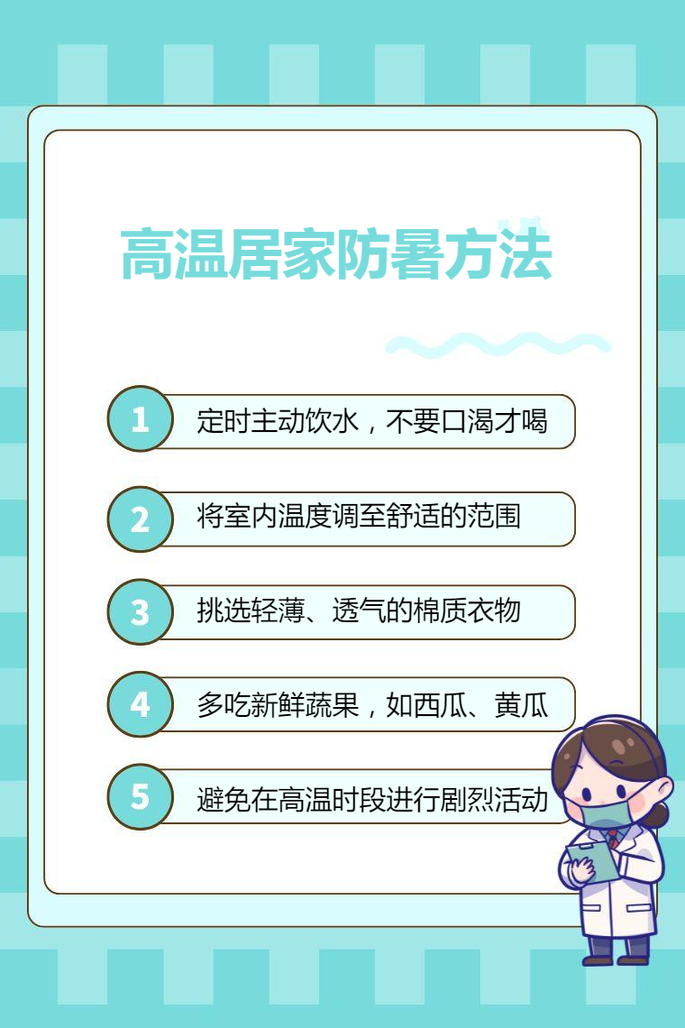 5. 适当安排活动:避免在高温时段进行剧烈活动,可选择清晨或傍晚较为凉爽的时候进行适量运动,活动量要适中,防止身体因过热而出现中暑等问题。