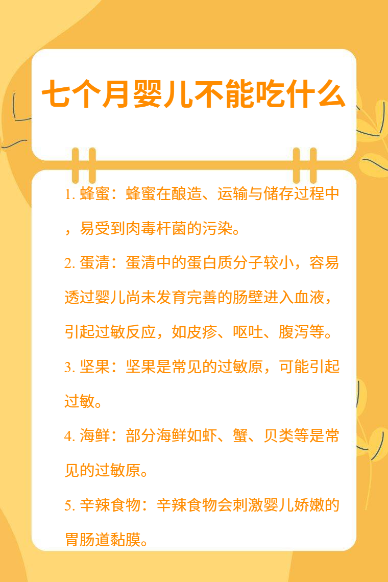 七个月婴儿不能吃蜂蜜、蛋清、坚果、海鲜、辛辣食物等。