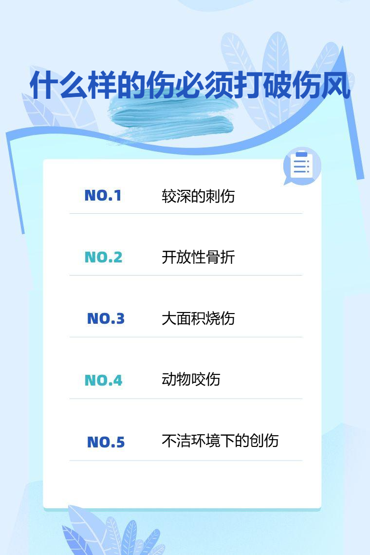 较深的刺伤、开放性骨折、大面积烧伤、动物咬伤、不洁环境下的创伤等必须打破伤风。