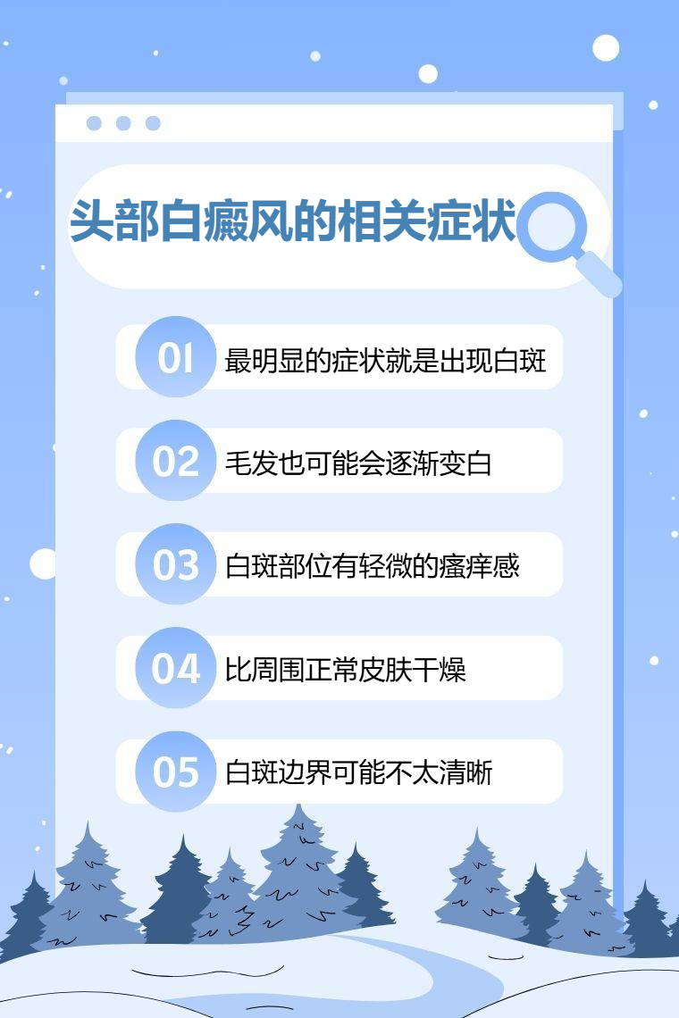 头部白癜风的相关症状有白斑、毛发变白、皮肤瘙痒、皮肤干燥、边界模糊等。