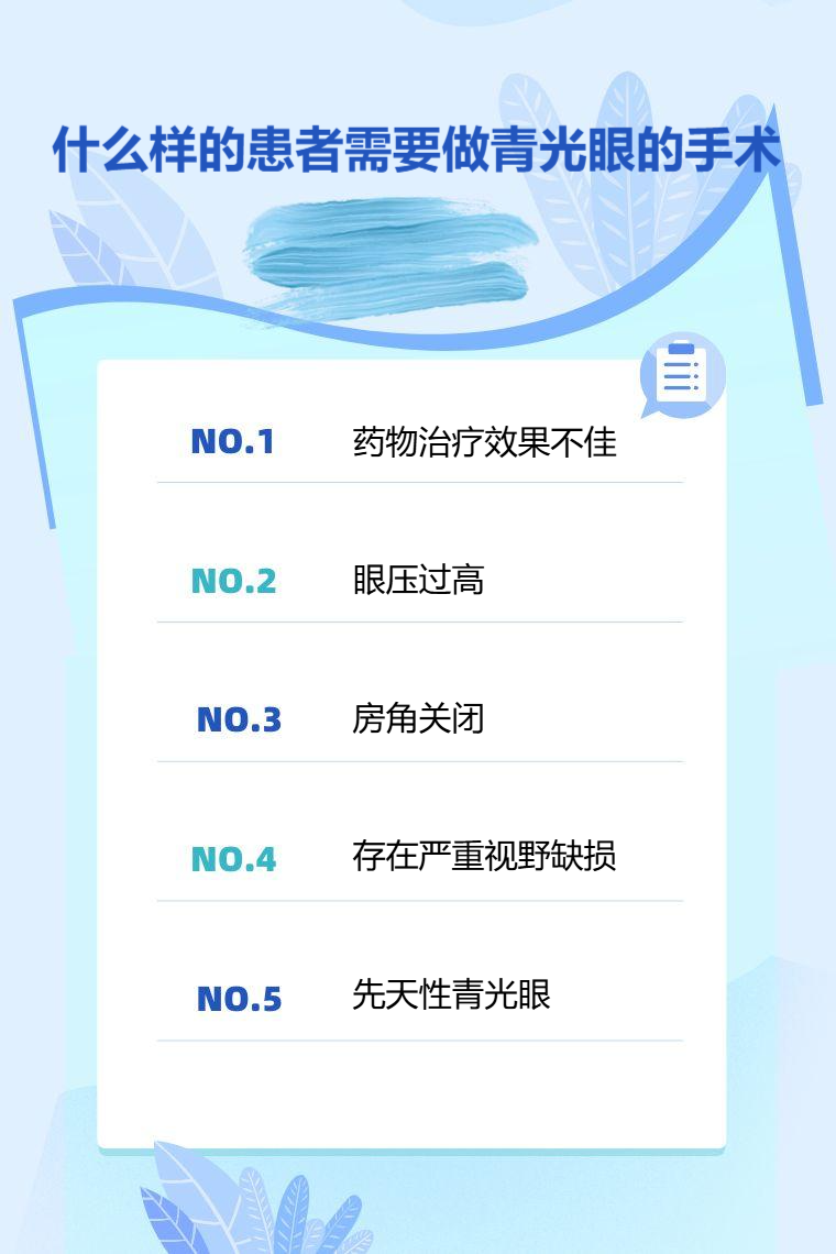 药物治疗效果不佳、眼压过高、房角关闭、存在严重视野缺损、先天性青光眼等患者需要做青光眼的手术。